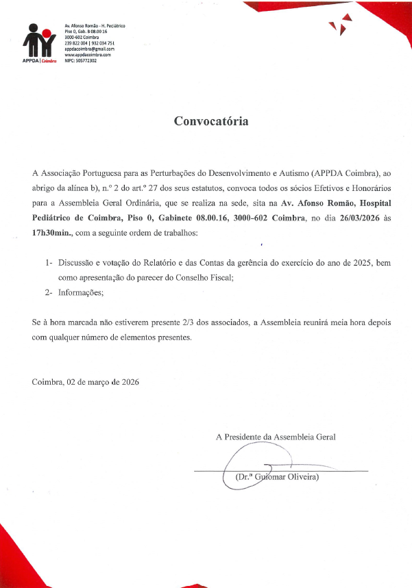 A APPDA Coimbra convoca todos os sócios para a sua Assembleia Geral Ordinária, dia 26 de março de 2026, às 17h30.